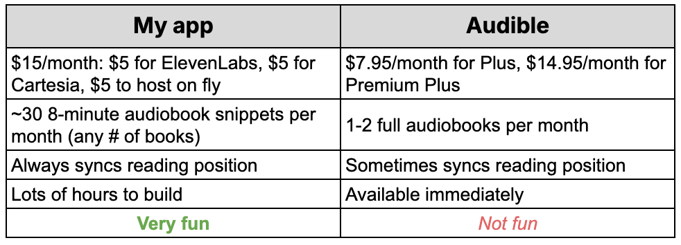 This very relatable scenario is just my life, so I built an app to generate audiobook snippets on-demand with AI—and they always sync.