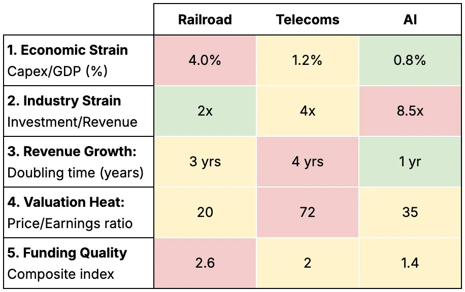 The analysis I find most helpful for understanding the current state + trend is Exponential View’s “gauge” framework. It uses five indicators that can be monitored and compared across current + historical situations to evaluate bubble risk; two reds = trouble, three reds = imminent trouble.